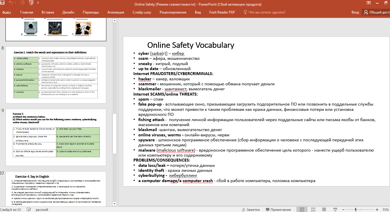 Материал содержит следующую информацию: что такое интернет-безопасность, основные угрозы и правила безопасности в Интернете, список лексики по теме, упражнения на тренировку лексики, тренировочные задания в формате ЕГЭ для устной части (задания 1 и 3). Данная разработка позволяет сэкономить время учителя или репетитора на подготовку материала к занятию. После проработки материала ученик умеет высказываться по теме. Материал оформлен в двух форматах: pdf и powerpoint.